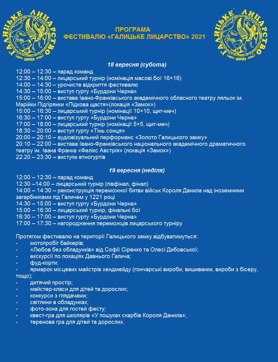 На містян та гостей чекають неймовірні локації: лицарський турнір, виступи відомих гуртів, вистави франківських театрів, реконструкція битви Короля Данила, а також майстер-класи, конкурси, дитячий простір, ярмарок, фудкорти тощо, йдеться на сторінці фестивалю у мережі, пише Бліц-Інфо.