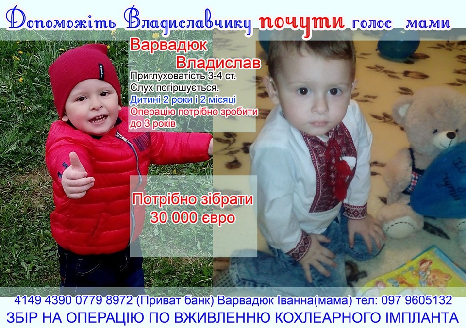 Для відновлення слуху дитини потрібна операція по вживленню кохлеарного імпланта. Орієнтовна вартість операції — 30 000 євро. Батьки не в змозі самостійно оплатити вартість операції, оскільки вже витратили велику суму грошей на лікування дитини.
