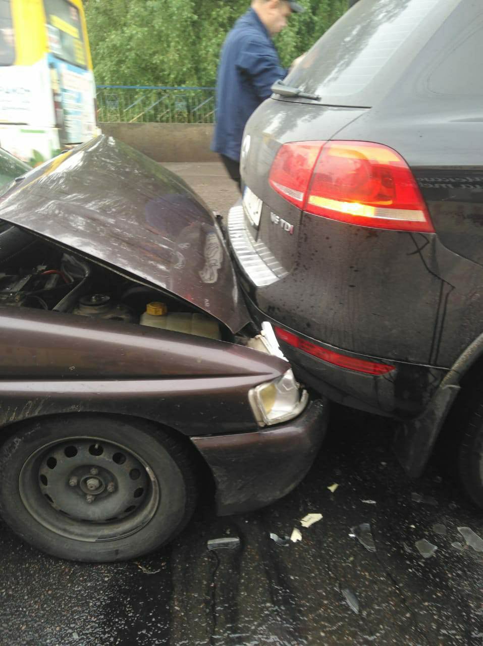 У прес-службі патрульної поліції повідомили, що в ДТП потрапили одразу п'ять машин - BMW 520 , ВАЗ 21015, VW TOUREG, FORD ESCORT, VW T4. Винуватець аварії на своїй машині втік, дві полоси зайняті. Потерпілих немає.