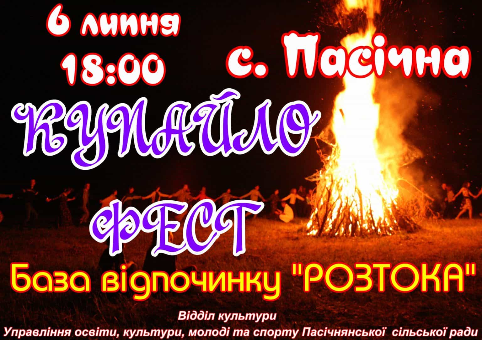 6 липня в с. Пасічна, база відпочинку “Розтока”, відбудеться етно-фестиваль “КУПАЙЛО-ФЕСТ” за участі клубних колективів Пасічнянської територіальної громади, переможців пісенного конкурсу “Голос громади-2021” та запрошених гостей.