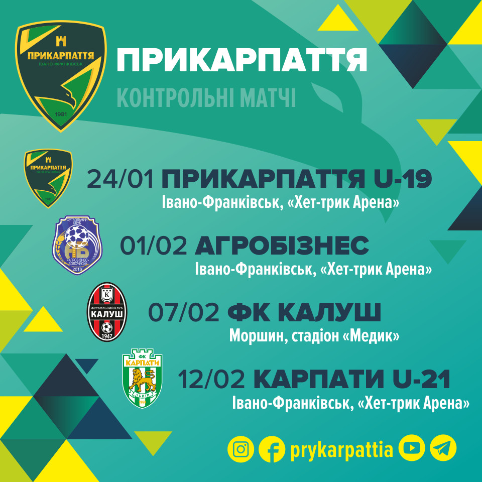 У рамках підготовки до весняної частини сезону 2019/20 тренерський штаб "Прикарпаття" запланував провести чотири контрольні матчі під час першого і другого тренувальних зборів. Три з них Команда рідного краю зіграє на штучному полі "Хет-трик Арени" в рідному Івано-Франківську, а ще один спаринг відбудеться у Моршині на стадіоні "Медик".