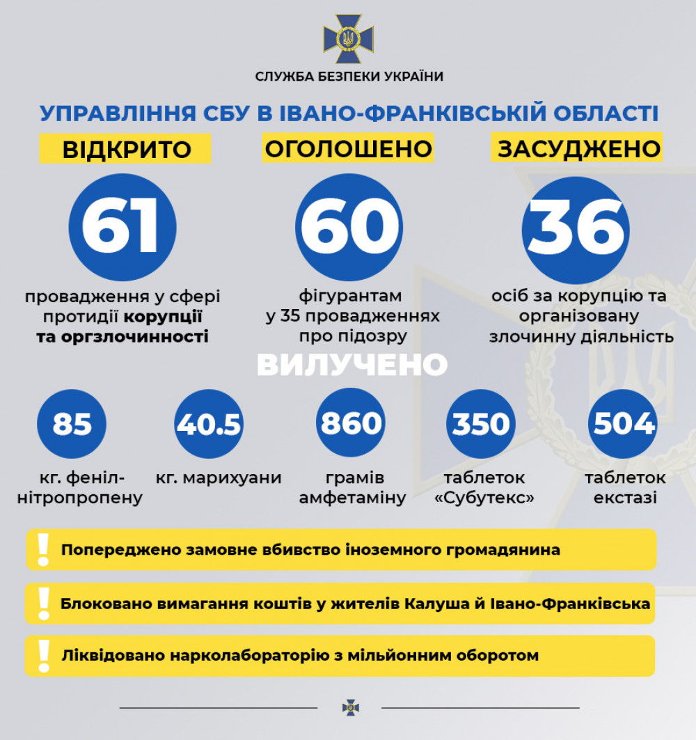 У 2020 році за матеріалами Управління Служби безпеки України в Івано-Франківській області розпочато 61 кримінальне провадження за фактами корупції та організованої злочинності. Повідомлено про підозру 60 фігурантам у 35 провадженнях. Судами винесено 30 обвинувальних вироків відносно 36 осіб.