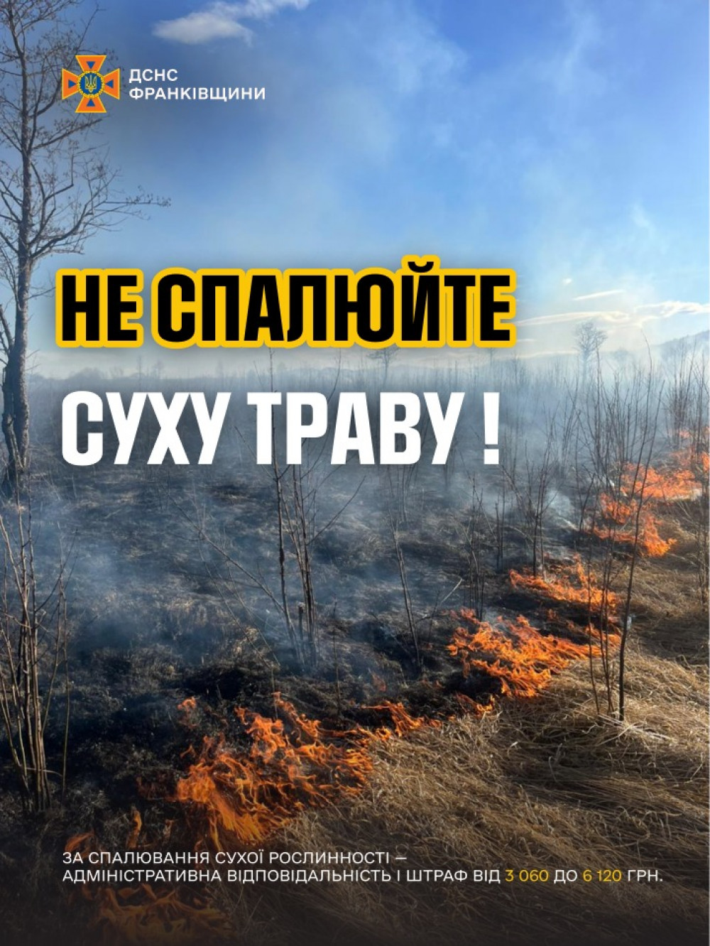 Також у ДСНС нагадують, що випалювання сухої рослинності — це порушення закону! Штрафи становлять від 3060 грн до 6120 грн, при цьому знищується ґрунт, забруднюється повітря, ставиться під загрозу життя тварин та людей.