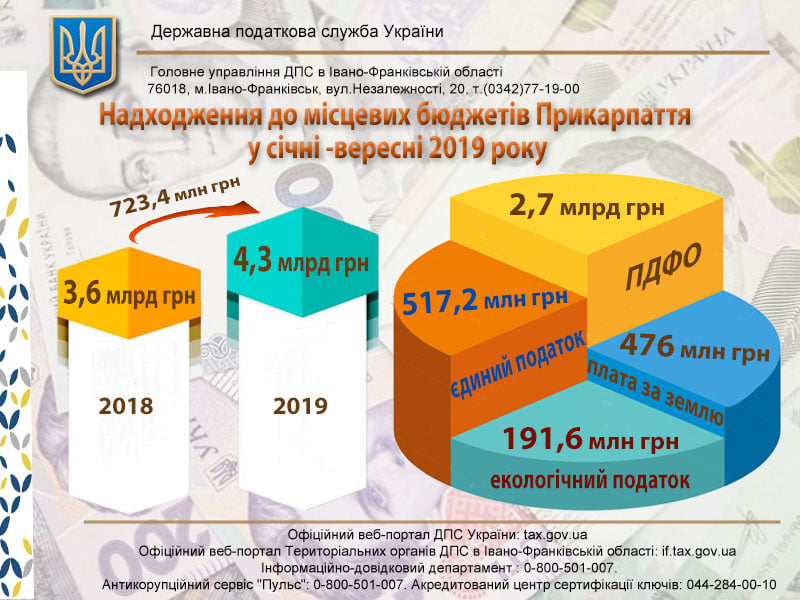 За дев’ять місяців поточного року до місцевих громад Івано-Франківщини надійшло 4,3 мільярда гривень податків та зборів, що на 732,4 мільйони гривень більше порівнюючи з відповідним періодом минулого року.