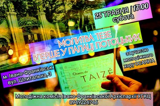 Уже цієї суботи, 25 травня, в Палаці Потоцьких, що в місті Івано-Франківську відбудеться молитва в дусі Тезе.