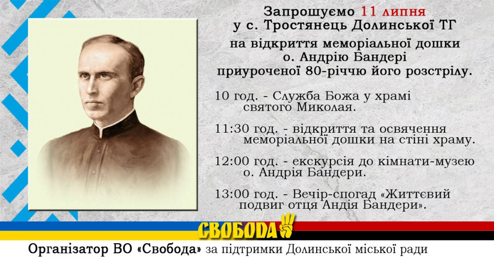 11 липня у с. Тростянець Долинської ТГ відбудеться відкриття меморіальної дошки о. Андрію Бандері приуроченої 80-річчю його розстрілу.