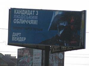 На біл-бордах рекламуються кандидати від ІПУ - Степан Чубакка та Дарт Вейдер, які є пресонажами культового фільму Джорджа Лукаса "Зоряні війни".
