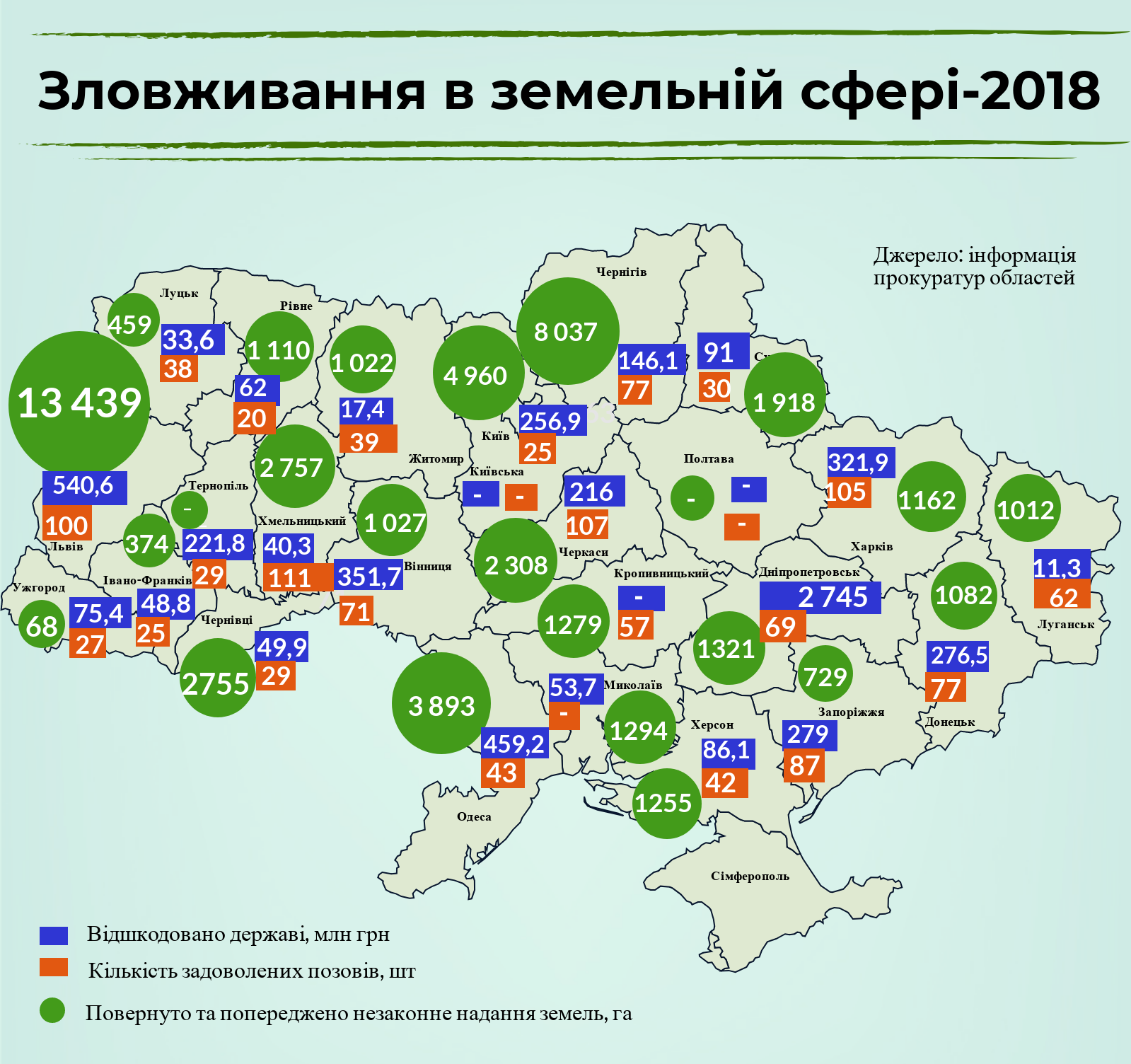 Кількість позовів прокурорів, які задовольнили суди за 2018 рік, у різних регіонах коливається від десятків до понад сотню. У регіонах-лідерах суди фактично кожні 3-4 дні задовольняли позови прокурорів щодо порушень в земельній сфері. Так у Хмельницькій області суд задовольнив 111 позовів за рік, у Черкаській – 107, у Харківській -105, у Львівській - 100. Найменше задоволених позовів у Рівненській (20), Івано-Франківській (25) та Закарпатській (27) областях.