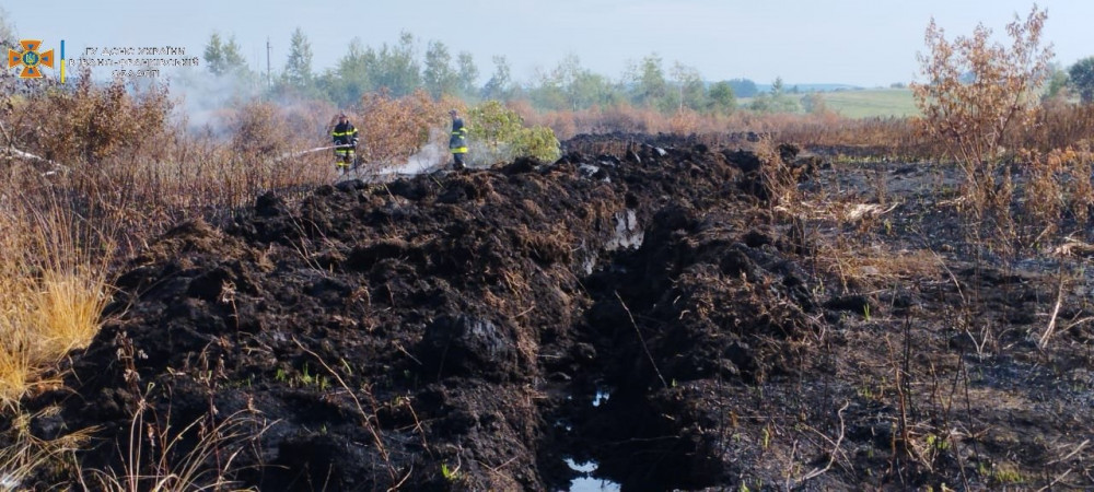 Продовжується гасіння пожежі торфу в селі Надіїв Долинської територіальної громади Калуського району, на площі 100 м кв. (глибина прогорання на окремих ділянках до 1 м).