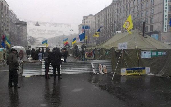 На Майдані Незалежності в Києві триває акція протесту. Люди п'ють чай з бутербродами, гріються біля бочок з багаттями, багато хто перебуває в наметах.