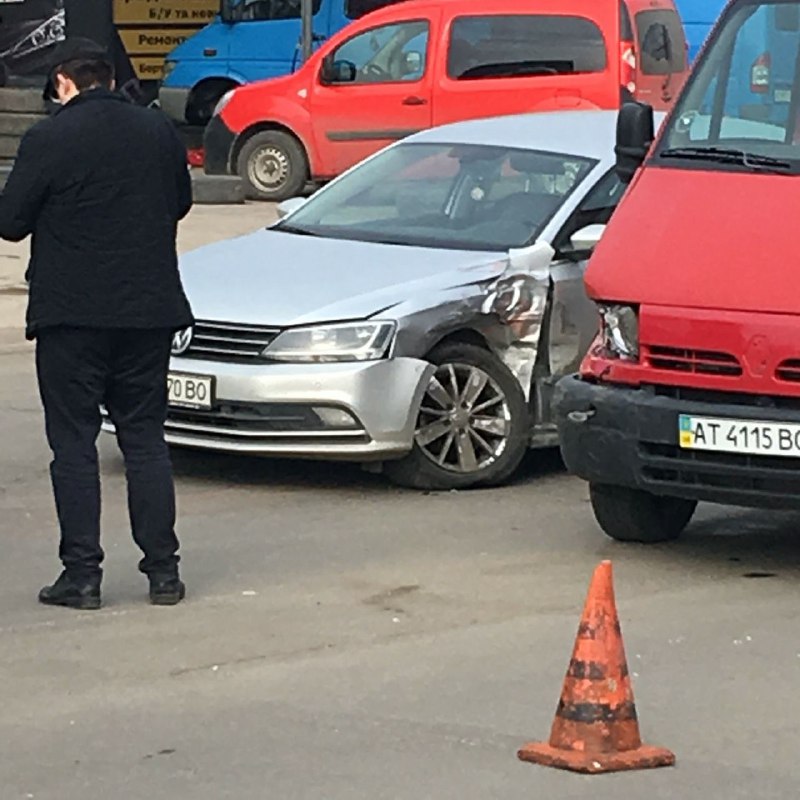 Як видно на фото легковик Volkswagen та мікроавтобус Renault не поділили дорогу. В обох автівках пом'яте бокове крило, також у Volkswage пошкоджене колесо.