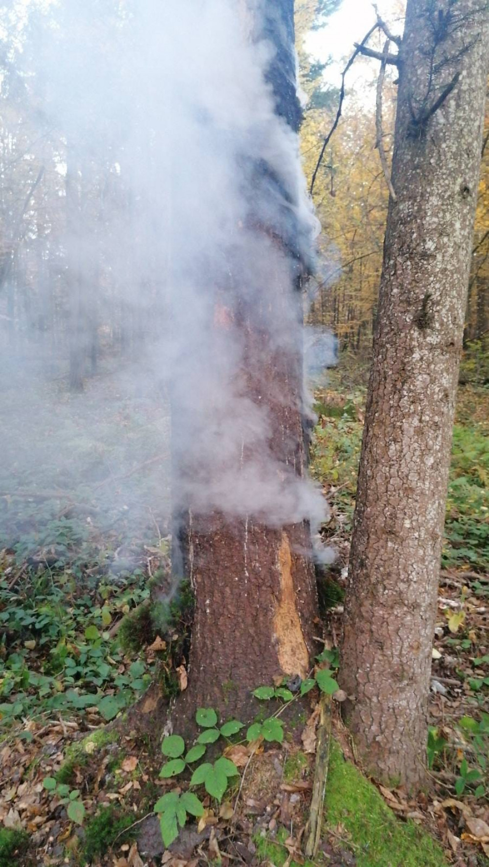 "Як розповів один з грибників Ярослав, вони викинули з відер гриби і у відрах носили воду, але до річки було далеко, а поблизу не було водойми, то хлопці обклали стовбур дерева вологим мохом і викликали рятувальників. Ми дякуємо за свідому позицію грибників, адже погода була суха і ймовірність поширення вогню на інші дерева та лісову підстилку була дуже висока",- йдеться в дописі.