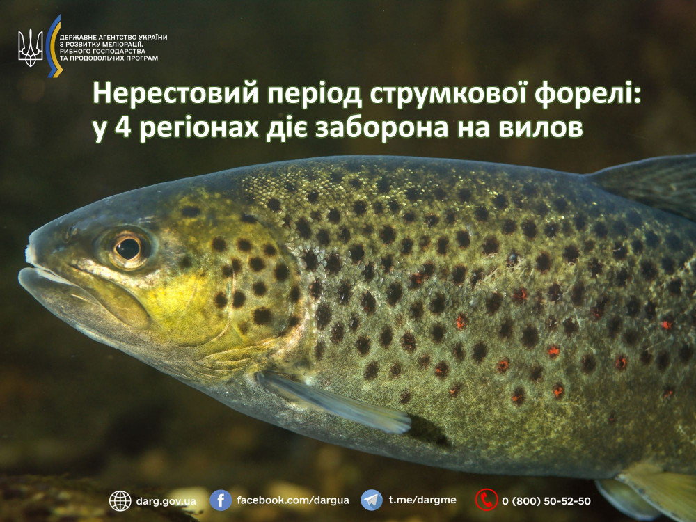 У водоймах Закарпатської, Івано-Франківської, Львівської та Чернівецької областей запроваджено заборону на вилов струмкової форелі (пструга струмкового) у зв’язку з початком її нерестового періоду.