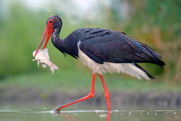 Чорний лелека прогулювався в пошуках їжі на річці Луква.