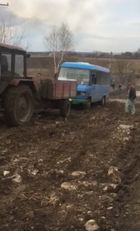 На Рогатинщині маршрутку тягнули трактором через жахливу дорогу