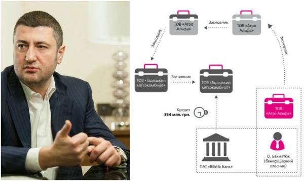 "Чомусь міністр (Арсен Аваков- ред.) нічого не пише про те, як можна було не знайти складу злочину у примітивній схемі Бахматюка, якою розорили банк: вкладники повелись на аномальні високі депозитні відсотки, занесли в VAB Банк кілька мільярдів гривень, які Бахматюк видавав у вигляді кредитів власним аграрним компаніям (на фото - типова схема). Кредити не повертали, банк розорився. Ми втратили: 5,1 млрд рефінансу від НБУ та 6,6 млрд, які Фонд гарантування віддав з наших кишень обманутим вкладникам", - зазначив Шабунін.
