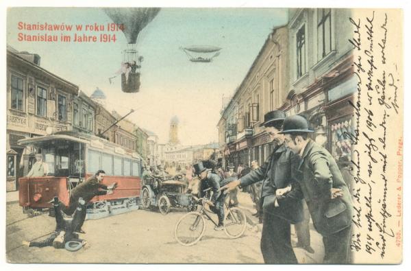 У 1904 році празьке видавництво Ледерера і Поппера випустило цікаву поштівку із видом вулиці Карпінського, тобто початку теперішньої Галицької (3). Краєвид перенасичений транспортними засобами: у небі парить повітряна куля, трохи далі пропливає дирижабль, а по дорозі рухаються роверист, автомобіль і… трамвай №15. Саме таким видавці уявляли собі Станиславів у 1914 році. І вони були не далеко від істини.