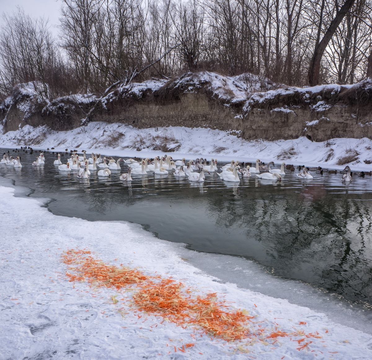 “Добрі люди перемістили лебедів з Коломийського озера, де вони катастрофічно замерзали, на ріку. Там вода протічна. Тепер їм тут добре”, – написав Ярема Проців і розмістив фото.