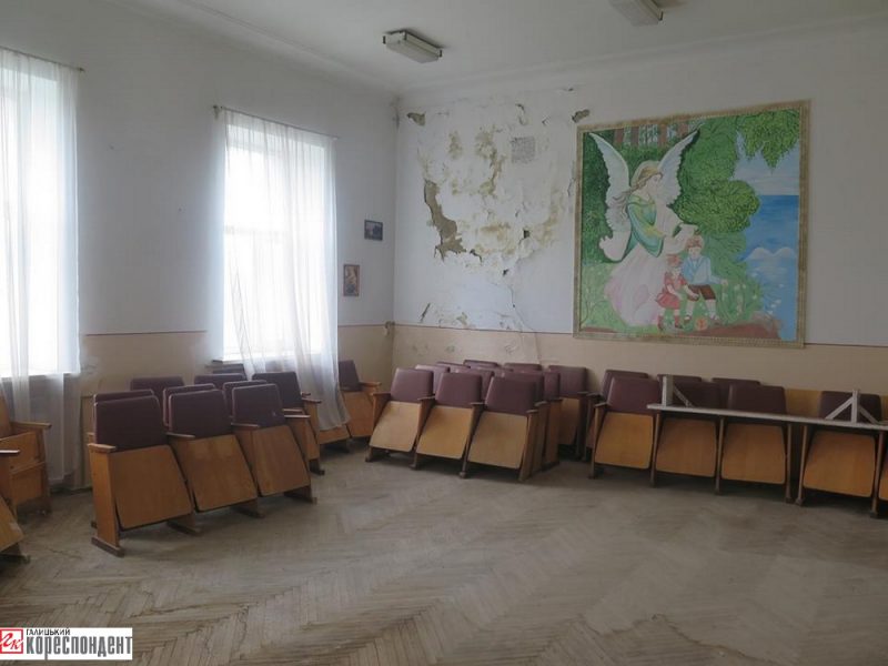 Ще одне моторошне місце – актовий зал. Частина стелі відпала зовсім, на підлозі під нею велика пляма, видно, що ця поверхня довго замокала. Стіни тут також почорніли й потріскали від сирості чи від старості. Раніше у цьому приміщенні проводилися наради, лікарські конференції, нині ж такої можливості немає, воно стоїть зачинене, пустує.