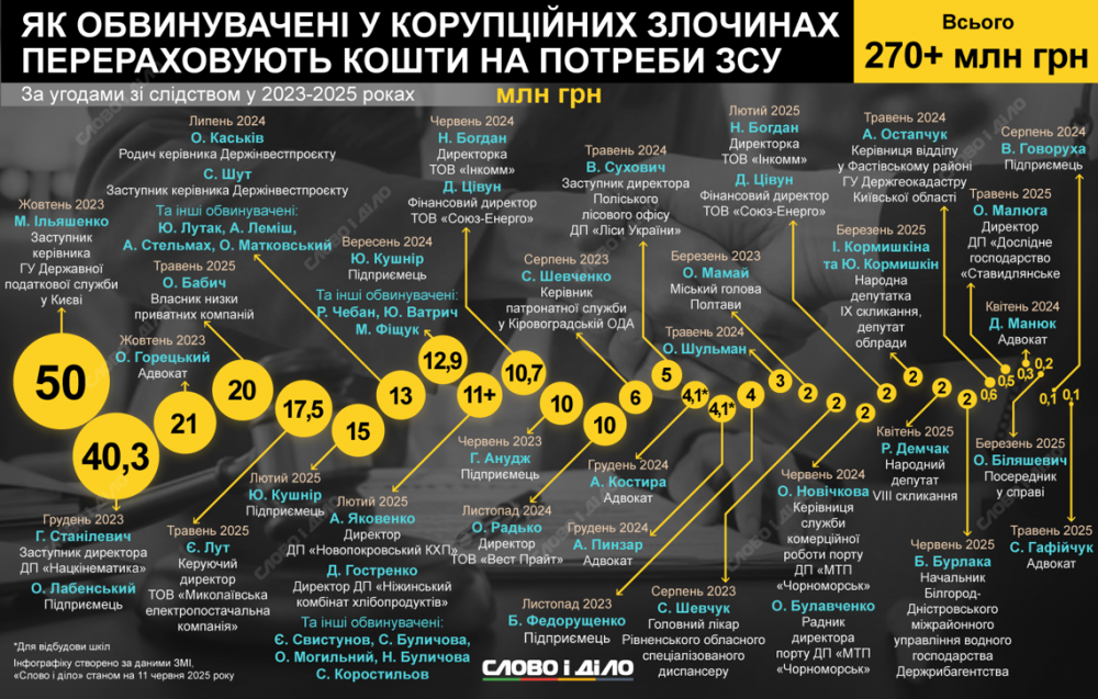 Станом на червень 2025 року обвинувачені у корупційних злочинах перерахували на потреби Збройних сил України та відновлення інфраструктури понад 270 мільйонів гривень.