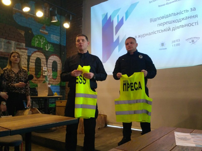 Зокрема, очільник поліції наголосив медійникам, що людина, з якою вони спілкуються, повинна знати, що це журналіст. Тому працівники Головного Управління Нацполіції в області розробили розпізнавальні жилетки для преси та подарували усім присутнім на заході.
