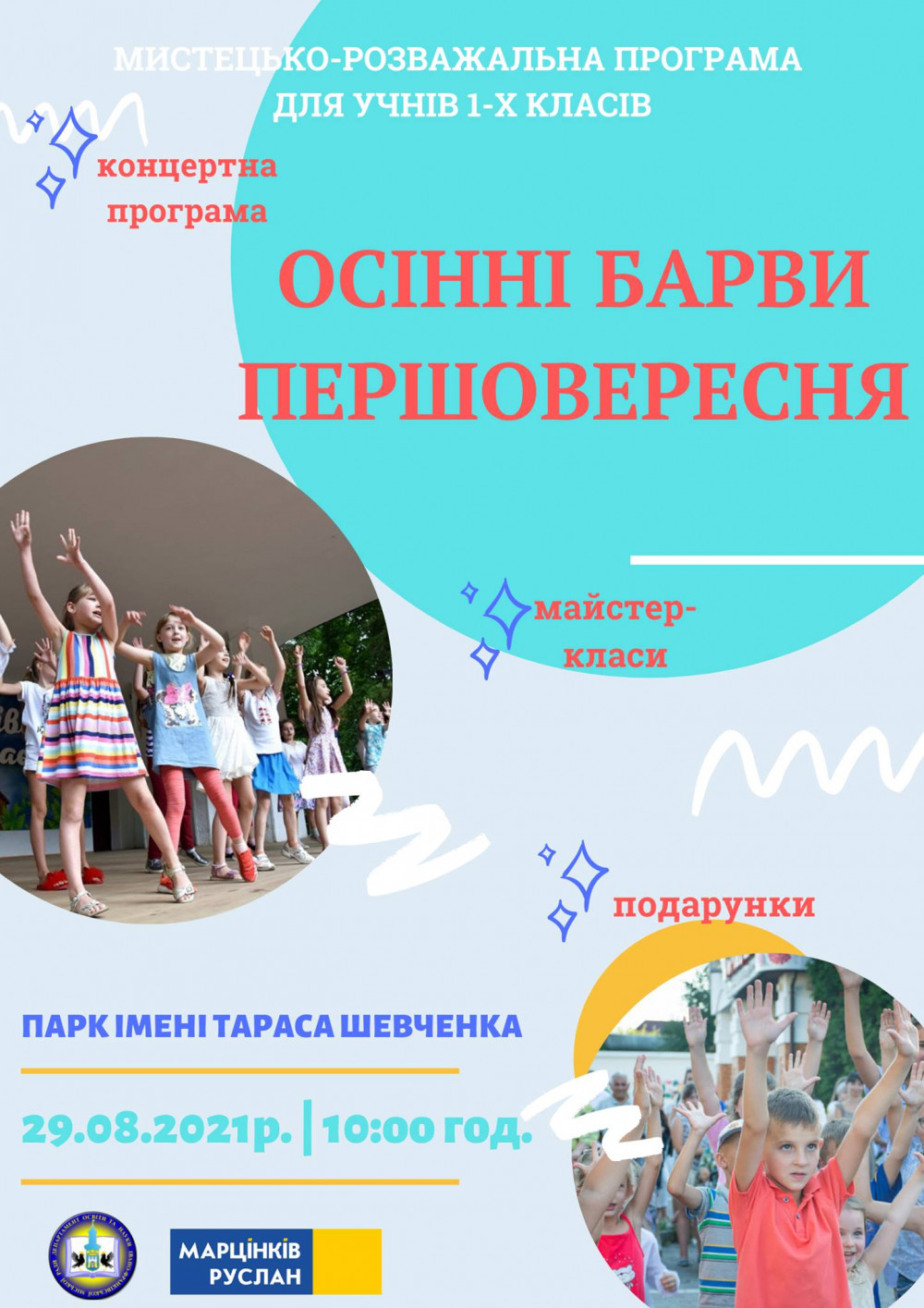 29 серпня о 10:00 год. у парку імені Тараса Шевченка розпочнеться ІІ мистецько-розважальна програма "Осінні барви першовересня" для наймолодших школярів!