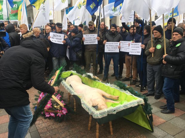 Під Радою проходить мітинг проти відкриття ринку землі, принесли свиню в труні