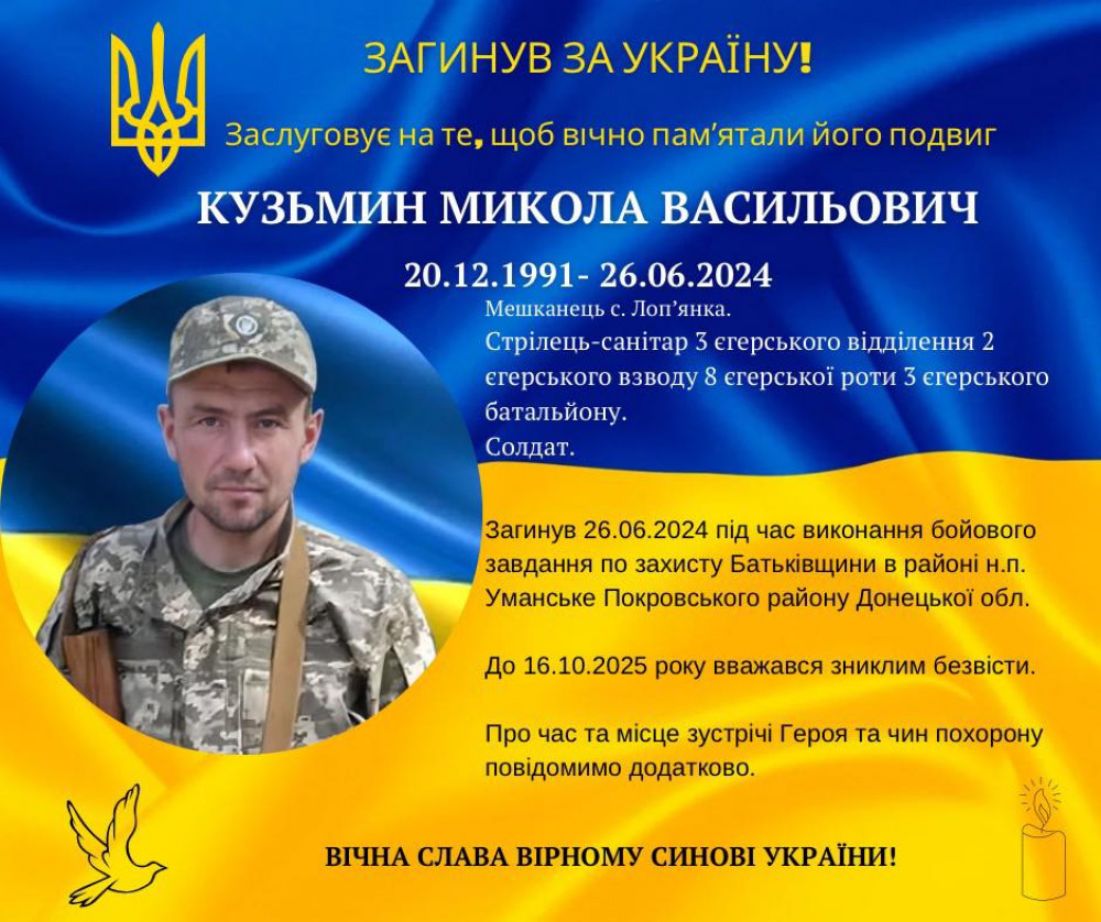 "Долинська громада знову в скорботі. Підтвердилась загибель Кузьмина Миколи, мешканця села Лоп’янка, який загинув під час виконання бойового завдання на Донеччині. Солдат, стрілець-санітар, вірний присязі та своїй державі — він до останнього подиху стояв за Україну. Війна — це страшне горе, яке забирає найкращих. Вона не щадить нікого, ламає долі й залишає біль у серцях рідних, друзів, усієї громади. Ми втратили ще одного Сина України — мужнього, відданого, справжнього Героя. Висловлюємо щирі співчуття родині, близьким та побратимам. Нехай пам’ять про Миколу Васильовича живе у наших серцях, а його подвиг буде прикладом незламності й любові до Батьківщини", - йдеться у повідомленні.