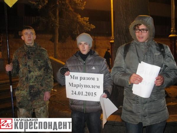 На Вічевий майдан іванофранківці прийшли зі свічками та плакатами: "Волноваха, Донецьк, Маріуполь. Хто наступний?", "Ми разом із Маріуполем - 24.01.2015", "Сьогодні Україна. Завтра увесь світ!", "Маріуполь, ми з вами". Окрім того, активісти виклали лампадками дату як пам'ятний знак про смерть маріупольців. Відтак отець Роман Кострубій помолився з присутніми за душі невинно вбитих мирних громадян.