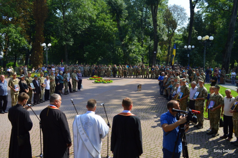 У сквері, поруч могил Героя Небесної сотні та бійців АТО священники відправили панахиду за душі загиблих. Побратими на колінах вшанували полеглих хвилиною мовчання.