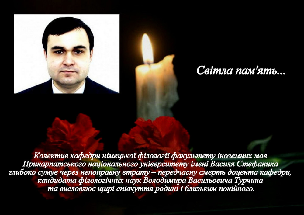Колектив кафедри німецької філології факультету іноземних мов Прикарпатського національного університету імені Василя Стефаника глибоко сумує через непоправну втрату – передчасну смерть доцента кафедри, кандидата філологічних наук Володимира Васильовича Турчина.