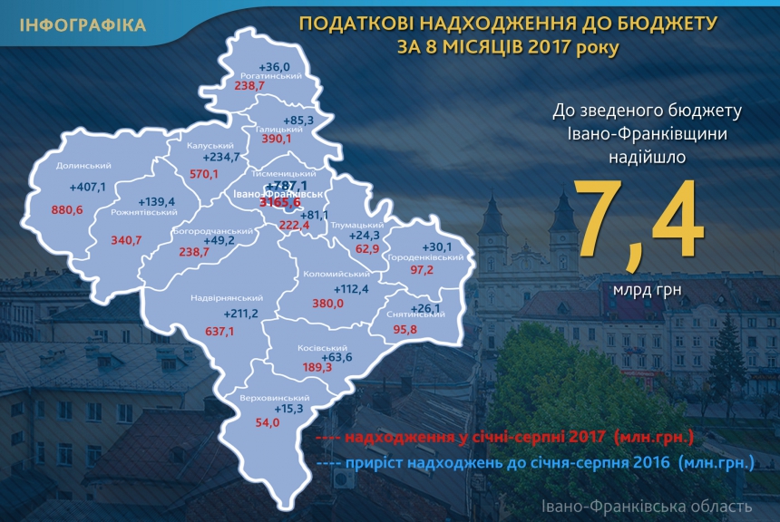 За січень-серпень 2017 року платники податків Івано-Франківщини сплатили до зведеного бюджету 7439,4 млн гривень податків і зборів, що на 2302,9 млн гривень більше у порівнянні з аналогічним періодом 2016 року.