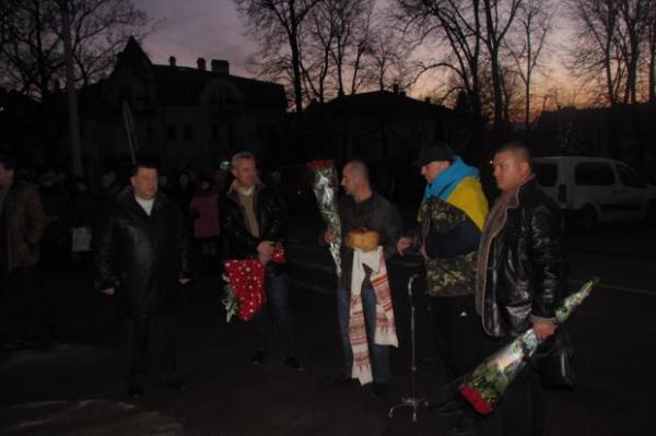 Товариші допомагають Олегові Климишину вийти. Його вітають із хлібом сіллю молоді дівчата у вишиванках.