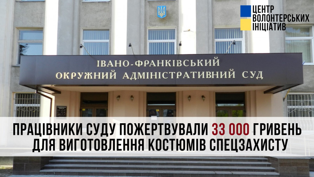 Колектив суду передав Центру волонтерських ініціатив пожертву у сумі 33 000 гривень. Це – 220 костюмів для медиків та поліцейських Прикарпаття.