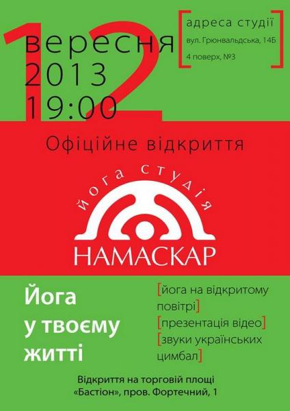 Запрошуємо Вас, 12 вересня о 19.00, відвідати презентацію йога студії "Намаскар". У разі несприятливих погодніх умов захід відбудеться всередині галереї Бастіон.