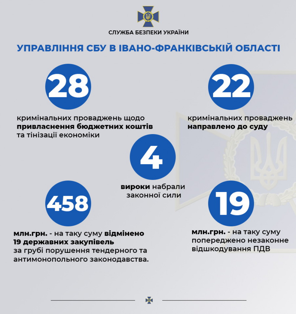 Зокрема, у 2020 році за матеріалами Управління СБУ в Івано-Франківській області було розпочато 28 кримінальних проваджень, пов’язаних із привласненням державних коштів та тінізацією економіки, 28 особам повідомлено про підозру, матеріали за 22 фактами – направлено до суду, 4 вироки набрали законну силу.