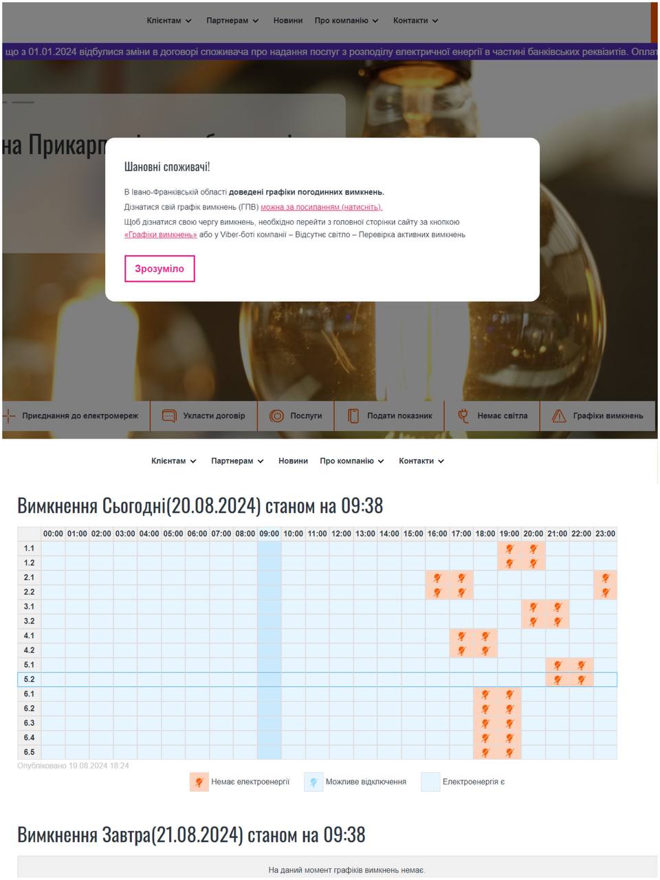 Прикарпатці можуть дізнатися про графіки відключень світла на головній сторінці обленерго