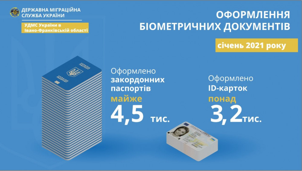 Опубліковано інфографіку про оформлення біометричних документів в Івано-Франківській області у січні цього року. Загалом оформлено 7660 паспортних документів.