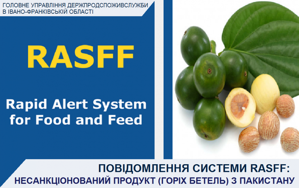 Головне управління Держпродспоживслужби в Івано-Франківській області інформує про отримання інформаційних повідомлень через систему швидкого оповіщення по харчових продуктах та кормах (RASFF) стосовно виявлення несанкціонованого новітнього харчового продукту (горіх бетель) з Пакистану.