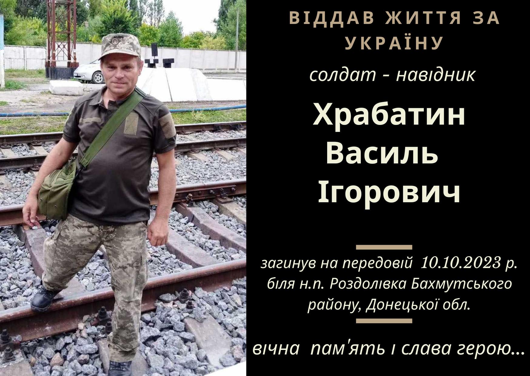 49-річний Василь Храбатин загинув у бою 10 жовтня біля села Роздолівка Бахмутського району.