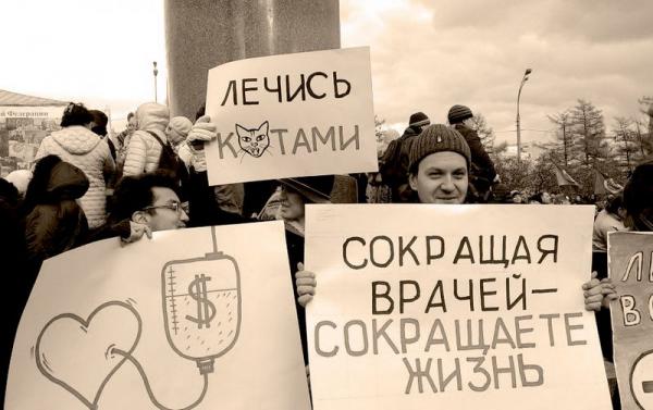Робилося все нишком, згоди суспільства на «нововведення» ніхто не просив. Чим все це закінчилося, видно не тільки з мітингу московських лікарів. Повідомленнями про захмарну дорожнечу кваліфікованої меддопомоги в Росії та її недоступності для мільйонів росіян рясніють ЗМІ та інтернет.
