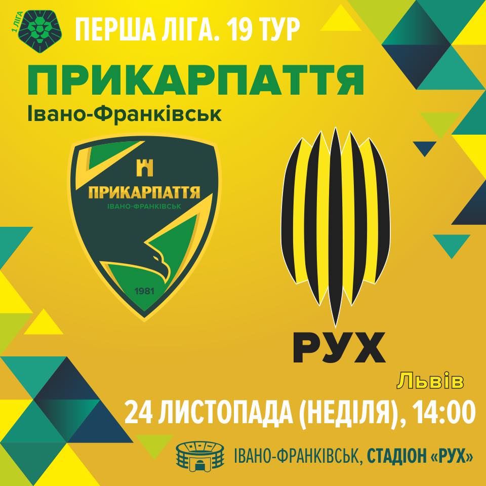 В заключному матчі 2019 року серед команд Першої ліги МФК Прикарпаття на власному полі прийматиме одного з лідерів чемпіонату - РУХ Львів.