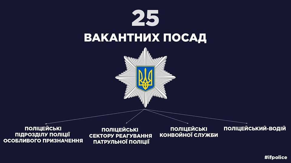 На Івано-Франківщині в Головному управлінні поліції розпочався конкурс на посаду поліцейського підрозділу поліції особливого призначення (5 вакансій), поліцейського сектору реагування патрульної поліції (10 місць), поліцейського конвойної служби (5 вакансій) та поліцейського-водія (5 місць).