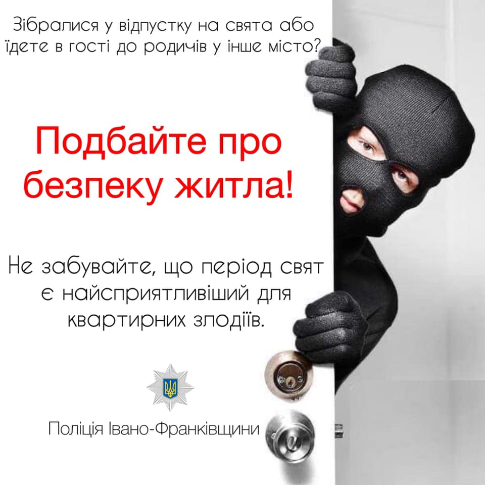 Під час свят чимало людей залишають без нагляду свої домівки. За цим стежать квартирні крадії й, як правило, за час зимових свят кількість квартирних крадіжок зростає.