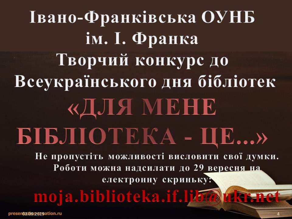 Івано-Франківська обласна універсальна наукова бібліотека ім. І. Франка оголошує творчий конкурс «Для мене бібліотека – це…», присвячений Всеукраїнському дню бібліотек.