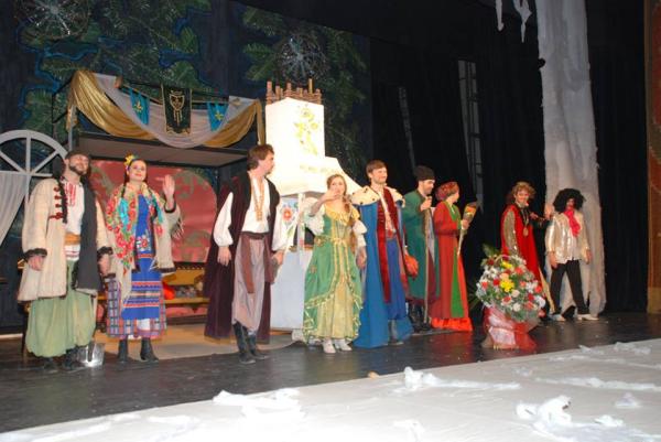 А потім розпочалася інтермедія – справжнє казкове дійство, але за сучасними мотивами, яку для діток підготували молоді актори театру. До дітей вийшла Зимонька і прикликала з собою двох веселих друзів – Нулика та Сімку, які почали з дітками веселу гру. Але ж яке новорічне свято без капостей – і от вже страшний Вірус все зіпсував – зупинив годинник, щоб не настав Новий рік, Зимоньку перетворив на Весну, яка раптом захотіла розтопити весь сніг, а Мавпочка – символ майбутнього року – уявила себе курочкою. Але, на щастя, розумні і кмітливі дітки всі разом – викликали Антивірус, який все виправив. І от уже нечемний Вірус у всіх присутніх попросив пробачення, і гарна Зимонька закликала діда Морозенка, який привітав діток та їх батьків зі святом і подарував їм найбільший і найгарніший подарунок, який тільки можна уявити – закликав переглянути виставу «По щучому велінню».