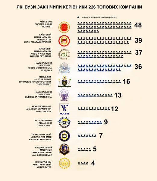 До четвірки лідерів увійшли : Національний технічний університет України «Київський політехнічний інститут», Київський національний університет імені Тараса Шевченка, Київський національний економічний університет імені Вадима Гетьмана та Національний університет «Києво-Могилянська академія». За даними опитування, чимало топ-менеджерів найбільших українських бізнес-структур є випускниками і молодих університетів, які сповідують нову, більш гнучку філософію освіти та приділяють увагу не тільки академічним дисциплінам, але й розвитку практичних навичок і презентації власних ідей. Серед них і випускники Прикарпатського національного університету імені Василя Стефаника.