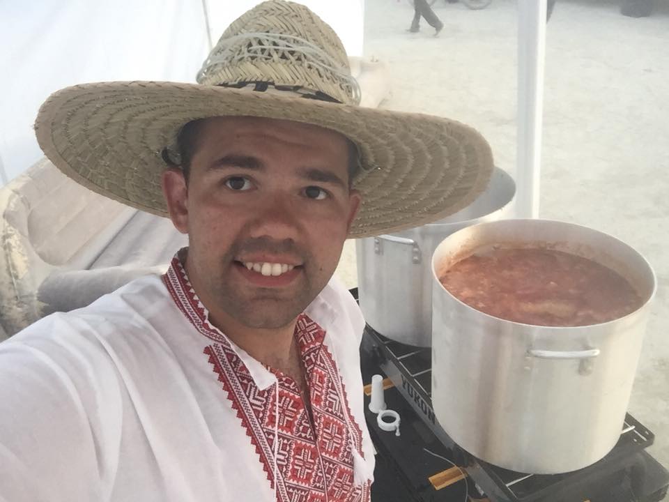 Оскільки кожен учасник Burning Man – частина дійства, то важливими є костюми. Франківці жили у таборі Borshch, тому везли українське вбрання. Євген мав вишиванку, капелюх і дерев’яний топірець. Щодня готували 50-літрову каструлю борщу з двома видами м’яса для всіх охочих. Роздавали безкоштовно, бо один із принципів фестивалю – дарувати і нічого не чекати натомість.