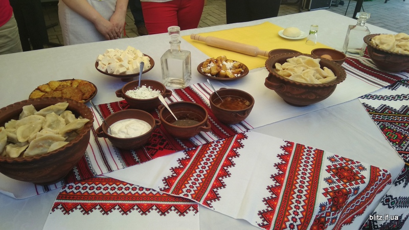 На літньому майданчику кінотеатру Люм'єр розклали стіл з різноманітними варениками, дерунами, бринзою, салом, інформує кореспондентка Бліц-Інфо.
