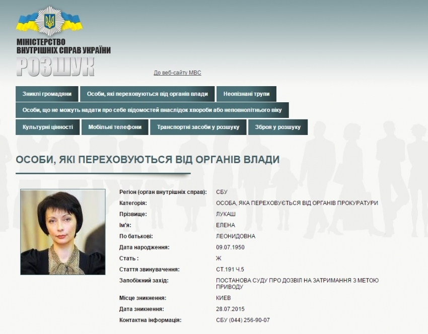 Служба безпеки України оголосила в розшук екс-міністра юстиції України Олену Лукаш.